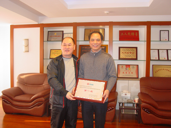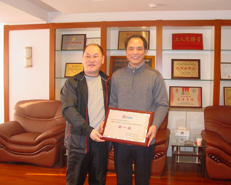 北京萬科領導親赴北京公司授牌 時間:2010-12-14 5354 北京公司在萬科地產第三季度萬科北京區域在建項目產品質量評估中,萬科藍山項目經專家現場實測實量,390個點合格率為99.39%,觀感質量評分、質量風險評估綜合得分97.35%,項目綜合排名蟬聯第一。12月12日上午,北京萬科副總經理孔祥明率工程部經理、項目總經理等一行,特地趕到我公司,把第一名的獎牌隆重授予我公司陳榮春總經理。陳總對萬科的肯定和信任表示感謝,并期望雙方進一步加強友好合作,永續真誠友誼。