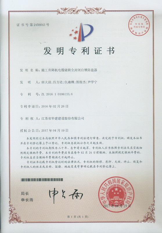 我公司又獲得一項(xiàng)國(guó)家發(fā)明專利授權(quán) 時(shí)間:2017-06-02 4116 日前,公司又一項(xiàng)發(fā)明專利獲得國(guó)家知識(shí)產(chǎn)權(quán)局授權(quán),此項(xiàng)專利名稱為“施工升降機(jī)電纜儲(chǔ)筒全封閉自鎖防盜器”,專利號(hào)為ZL 2016 1 0106133.6。 至此,公司已有22項(xiàng)發(fā)明專利入賬。