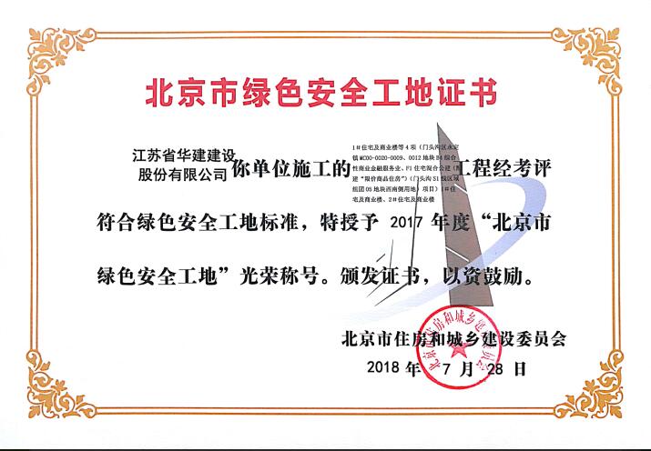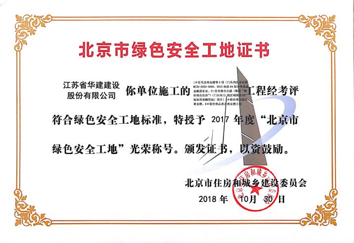 北京市綠色安全工地光榮稱號,并獲頒證書。