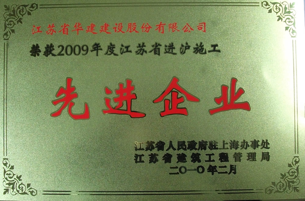 310,在江蘇省政府駐滬辦、江蘇省建管局召開(kāi)的2009年度江蘇進(jìn)滬施工總結(jié)表彰暨迎世博動(dòng)員大會(huì)上,江蘇華建被表彰為“江蘇省進(jìn)滬施工先進(jìn)企業(yè)”,這已是第七次獲次殊榮;表彰會(huì)上, 上海洛克外灘源總承包項(xiàng)目部、中船臨港二期加工綜合樓項(xiàng)目部被評(píng)為優(yōu)秀項(xiàng)目部,另有3人被評(píng)為優(yōu)秀項(xiàng)目經(jīng)理,各有1人被評(píng)為安全管理先進(jìn)個(gè)人、質(zhì)量管理先進(jìn)個(gè)人、經(jīng)營(yíng)管理先進(jìn)個(gè)人、財(cái)務(wù)管理先進(jìn)個(gè)人,有2人被評(píng)為綠色施工管理先進(jìn)個(gè)人。
