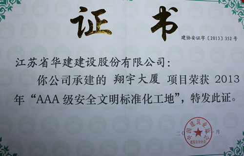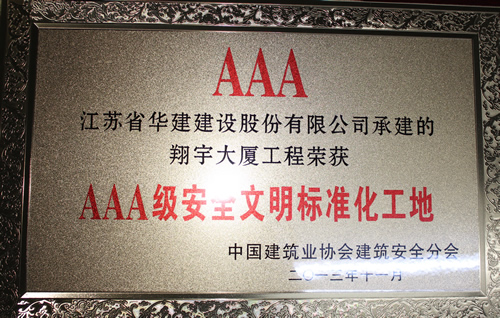 公司首獲全國“AAA級安全文明標準化工地” 時間:2013-12-12 5192 日前,由上海區域公司蘇北分公司承建的淮安翔宇大廈被中國建筑業協會評為2013年全國“AAA級安全文明標準化工地”,這是國內安全文明施工最高獎項,旨在規范建筑施工安全生產,保障建筑職工安全與健康,提高施工現場安全管理水平。這是上海區域公司第一次獲此殊榮,也是江蘇華建第8項全國3A級安全文明標準化工地,該工程還被評為2012年度江蘇省建筑施工文明工地、2013年度江蘇省建筑業新技術應用示范工程。