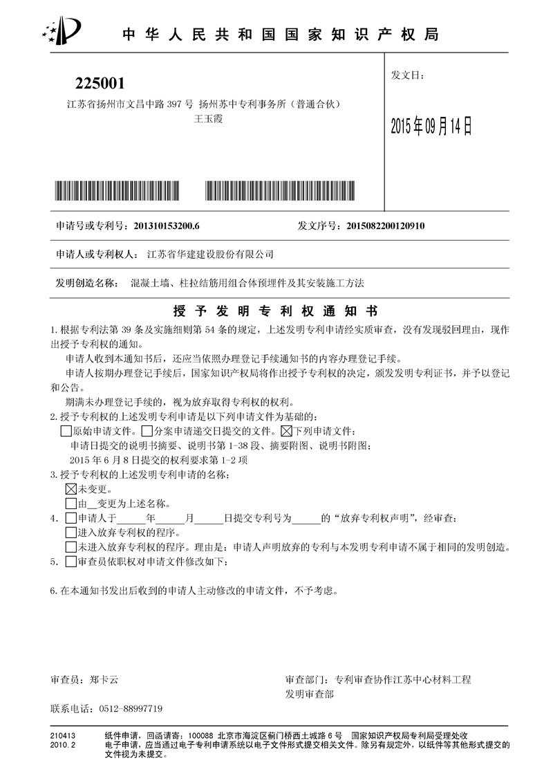 公司獲一項發(fā)明專利 時間:2015-09-15 5841 日前,江蘇華建上海區(qū)域公司發(fā)布的《混凝土墻、柱拉結(jié)筋用組合體預(yù)埋件及其安裝施工方法》發(fā)明創(chuàng)造被國家知識產(chǎn)權(quán)局授予“發(fā)明專利權(quán)”,專利號:201310153200.6。