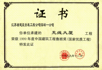 無線大廈(現名國通大廈)位于福田區新洲,建筑面積73069M2,高度201.5M,地下室2層,地上43層,是一座高智能化的電信寫字樓,結構設計為鋼筋砼框架一筒體結構,8-32層為無粘結預應力樓板砼,工程總造價6億元。工程于1995年6月開工,1997年12月竣工,施工中主要應用了無粘結預應力砼、高強泵送砼、粗直徑鋼筋連接、外墻干掛花崗巖等新技術。榮獲深圳市、廣東省、江蘇省的優質樣板工程,“江蘇省新技術應用示范工程”、江蘇省“揚子杯”獎和99年度國家“魯班獎”。
