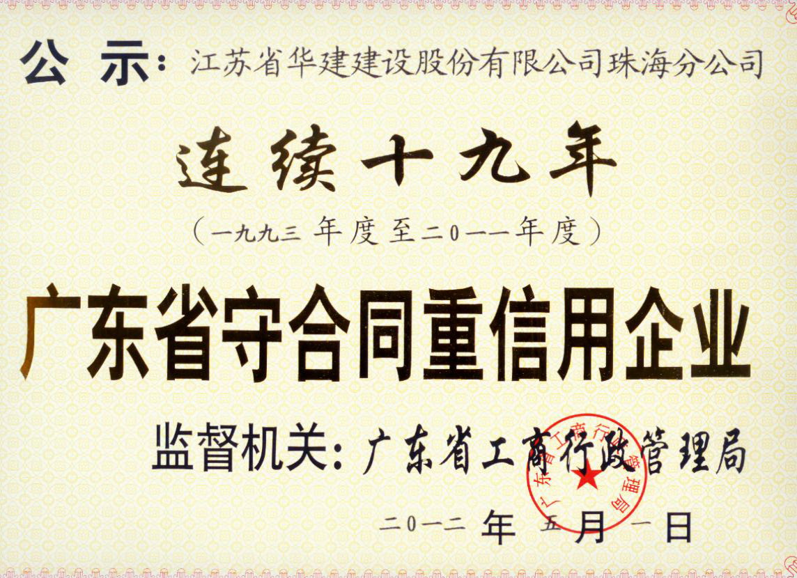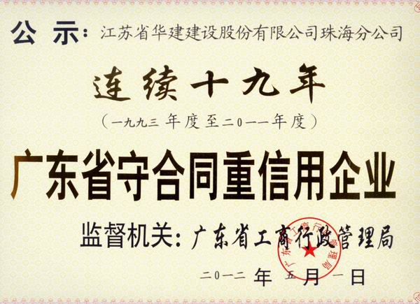 珠海公司連續19年榮獲“廣東省守合同重信用企業”榮譽稱號 時間:2012-06-28 6014 珠海公司連續19年榮獲“廣東省 守合同重信用企業”榮譽稱號 五月份珠海分公司被廣東省工商行政管理局授予“連續十九年廣東省守合同重信用企業”榮譽稱號。