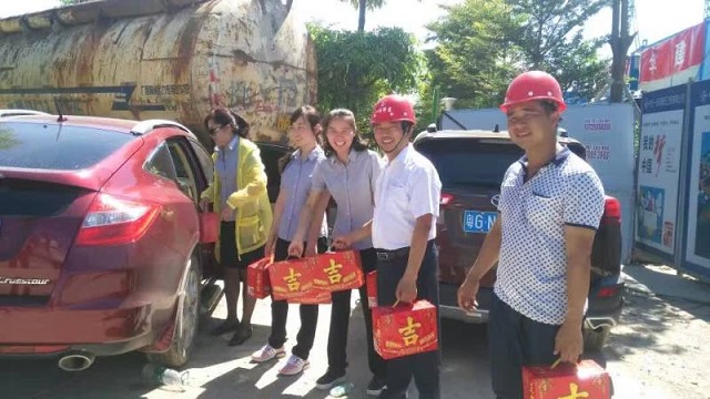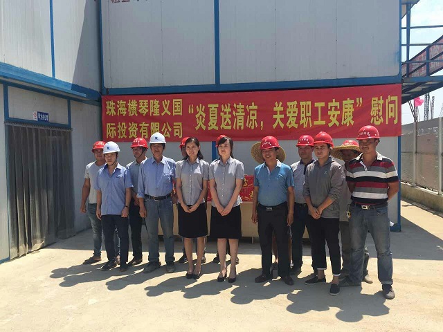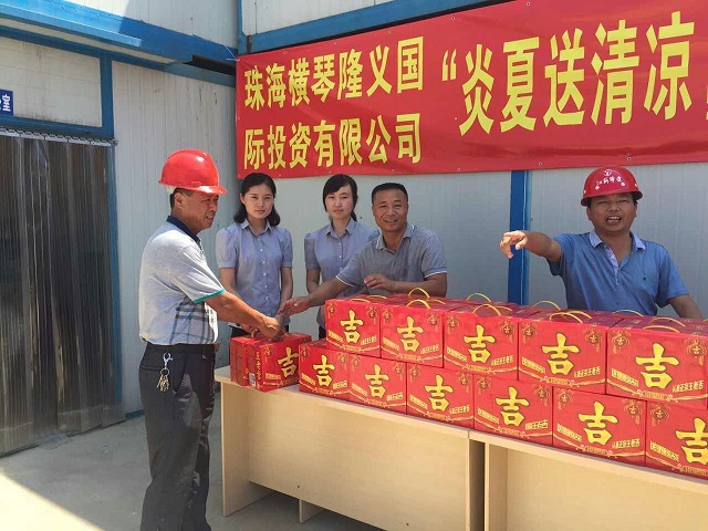 炎炎夏日送清涼 時間:2016-08-01 4003 7月30日上午,珠海分公司橫琴隆義廣場項目部工地熱浪朝天,機聲隆隆,人來人往,一派繁忙景象。一支由江蘇華建直五項目部和橫琴隆義投資公司共同組成的“送清涼”小分隊也在工地上奔忙著,項目經理姚寧與投資公司負責人王艷、許珂等正在將一箱箱王老吉飲料有條不紊地送到建筑工人手中,讓廣大一線職工在炎炎烈日下感受到陣陣清涼。