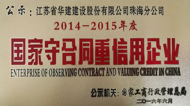 公司榮獲國家級“守合同重信用”企業稱號 時間:2016-08-02 2966 日前,國家工商行政管理總局向社會公示2014-2015年度“守合同重信用”企業名單,珠海公司榮獲國家級“守合同重信用”企業稱號。 珠海市共計13家企業被國家工商總局表彰為2014-2015年度“守合同重信用”企業,其中新上榜企業4家。榮獲該稱號充分展現出江蘇華建在珠海市場守法履約的良好施工企業形象。