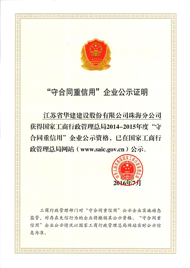 江蘇省華建建設股份有限公司珠海分公司已連續二十三年獲評廣東省“守合同重信用”企業稱號,并于2004年、2016年兩次獲評國家級“守合同重信用”企業稱號。