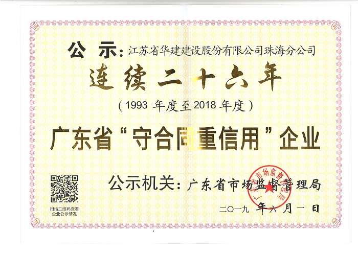 公司連續(xù)二十六年被廣東省市場監(jiān)督管理局表彰為“守合同重信用企業(yè)”