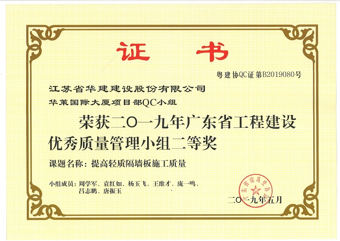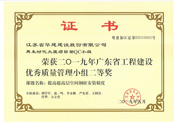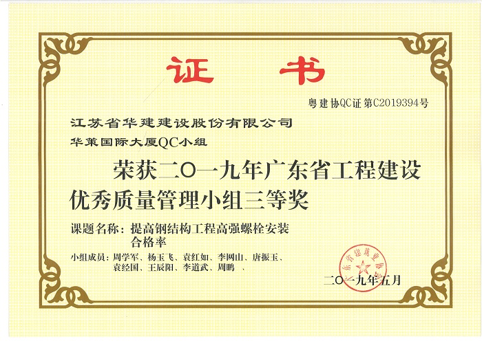 近期,廣東省建筑業協會發文公布了2019年度廣東省工程建設優秀質量管理小組名單,公司華策國際大廈項目部QC小組“提高輕質隔墻板施工質量”、再生時代項目部QC小組“提高超高層空間鋼柱安裝精度”兩項成果喜獲二等獎,華策國際大廈項目部QC小組“提高鋼結構工程高強螺栓安裝合格率”榮獲三等獎。