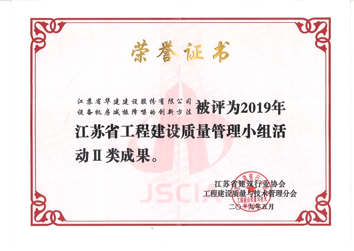 華策國際大廈項目部QC小組“設備機房減振降噪的創新方法”成果在江蘇省建筑業協會組織的2019年度江蘇省工程建設質量管理小組活動中榮獲二等獎。
