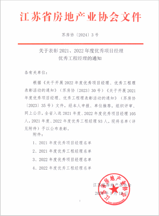 近日,江蘇省房地產(chǎn)協(xié)會公布了《關(guān)于表彰2021、2022年度優(yōu)秀項(xiàng)目經(jīng)理、優(yōu)秀工程經(jīng)理的通...