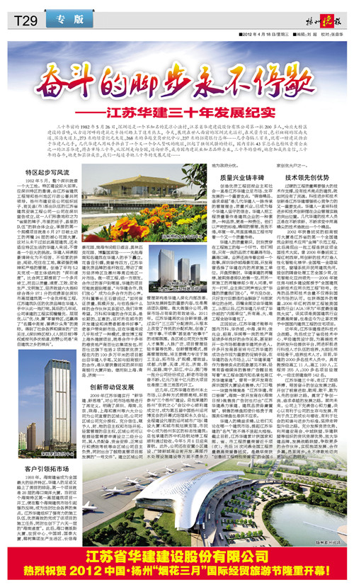 4月18日,《揚州晚報》T29版刊發專版文章《奮斗的腳步永不停歇——江蘇華建三十年發展紀實...