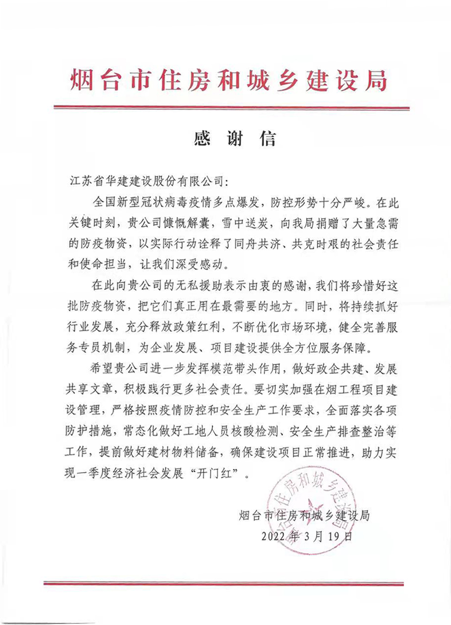 3月19日,公司收到煙臺市住建局發來的感謝信,信中對公司大力支持疫情防控,捐贈防控物資表示...