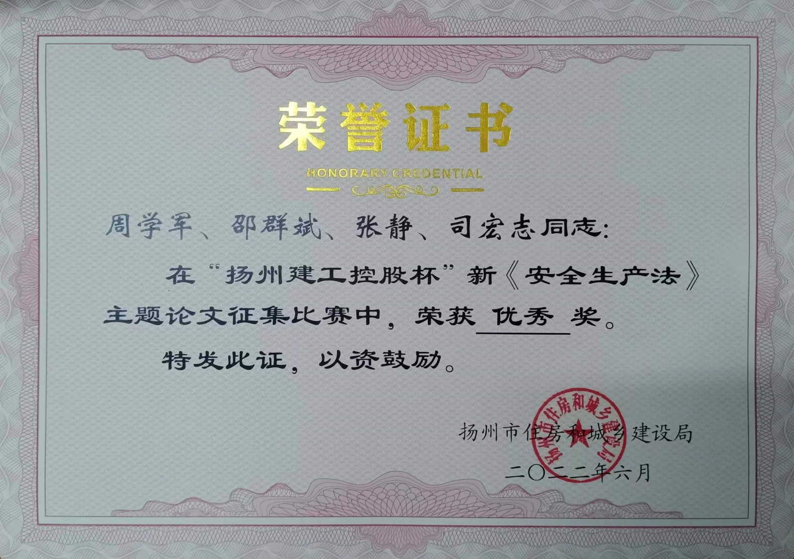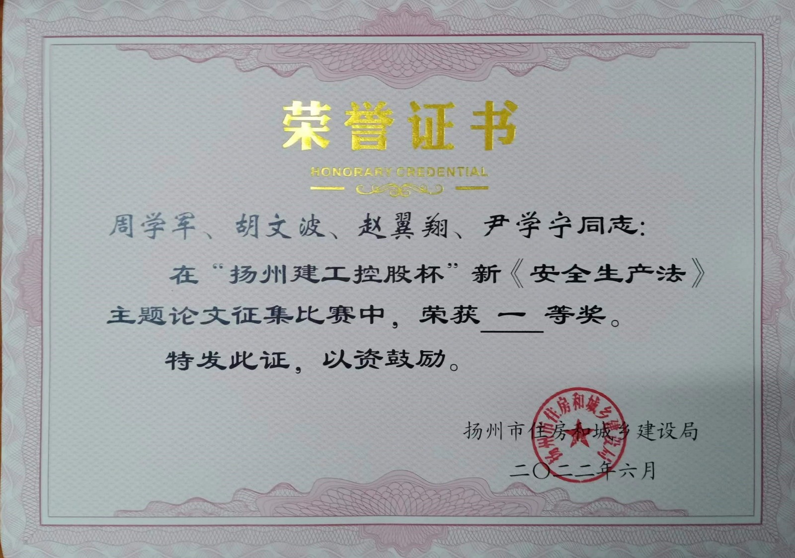 北京分公司4篇論文獲揚州市新《安全生產(chǎn)法》主題論文征文比賽獎項 時間:2022-07-16 4079 近日,從揚州市住房和城鄉(xiāng)建設(shè)局傳來喜訊,由北京公司投稿的4篇論文榮獲“揚州建工控股杯”新《安全生產(chǎn)法》主題論文征文比賽獎項,并獲頒證書,其中一等獎一項,三等獎一項,優(yōu)秀論文獎兩項。