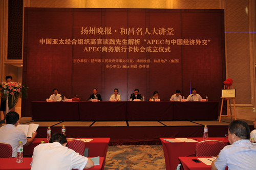 831,揚州市APEC商務(wù)旅行卡協(xié)會成立大會在香格里拉大酒店舉行,揚州市副市長祁小夏、中國APEC高官談踐及外交部領(lǐng)事司有關(guān)負責(zé)人出席會議。會議一致推舉我公司董事長陸金龍擔(dān)任該協(xié)會會長。