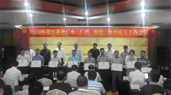 海南分公司榮獲2013年江蘇進粵、桂、閩、瓊施工先進企業 時間:2014-04-28 3987 4月25日,2013年度江蘇進廣東、廣西、福建、海南施工工作會議在珠海市市委黨校學苑賓館召開。會上,海南分公司榮獲“2013年江蘇進粵、桂、閩、瓊施工先進企業”,高家馴被表彰為“2013年江蘇進粵、桂、閩、瓊施工優秀企業經理”,1人被評為優秀建造師、2人分別被評為質量安全和經營財務管理先進個人。 另訊:4月19日,從中國施工企業管理協會第29次年會傳來喜訊,海南公司匡新益被評為2013年度“全國工程建設優秀項目經理”。