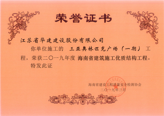 近日,海南省建設工程質量安全監測協會發文表彰了一批2019年度上半年海南省建筑施工優質結構工程,江蘇華建海南分公司承建的3個項目上榜,分別是:三亞奧林匹克廣場項目、中國電科海洋信息產業基地項目(B01-03地塊培訓交流中心)項目、景園悅海灣二期南區23#樓項目。