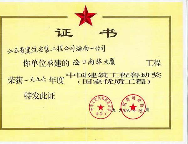 ??谑心先A大廈工程于1994年5月竣工,1995年6月被評(píng)為海南省優(yōu)質(zhì)樣板工程,1995年12月被評(píng)為建設(shè)部?jī)?yōu)質(zhì)樣板工程,1996年10月榮獲魯班獎(jiǎng)。